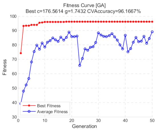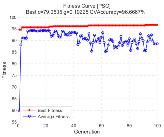 Using shift invariant sparse feature, optimized SVM with three methods including grid search, GA and PSO were respectively conducted. For all the methods, the selection ranges of (c, g) are restricted to 2−10 to 210 and 5-fold cross validation is used. As for grid search, the logarithms of c and g based on 2 are stepped with the step size 1. With regard to GA and PSO, the fitness represents the c ross-validation accuracy and the population size is 20, the max generations are 100. The other parameters of GA including crossover and mutation probability are set to 0.4 and 0.2, respectively, while the other parameters of PSO are: wv = 1, wp = 1, c1 = 1.5 and c2 = 1.7. The result of the grid search is demonstrated in Figure 12, while Figure 13 and Figure 14 demonstrate the fitness curves of GA and PSO, respectively. The figures show that the loops in the GA algorithm are terminated at the 50th generation and based on the training set, the best cross validation accuracies of the three methods corresponding to the best (c, g) are relatively high.