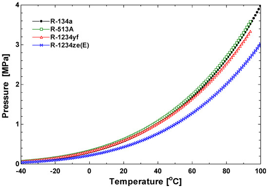 Table 1 and Figure 1 show the general properties and vapor pressures of R-134a compared to the alternative refrigerants R-1234yf, R-1234ze(E), and R-513A. The GWP values of R-1234yf and R-1234ze(E) were significantly lower than R-134a. The thermo-physical properties of refrigerants in Table 1 and Figure 1 were calculated using NIST REFPROP [11]. However, R-1234yf and R-1234ze(E) are mildly flammable and classified as A2L. R-1234ze(E) has a lower saturation pressure than R-134a (75% of R-134a at a saturation temperature of 35 °C); therefore, the design of the system requires modification, and the pressure drop is relatively high.