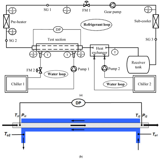 A schematic of the experimental facility is shown in Figure 2. The facility consists of one refrigerant loop and two water loops [24]. The refrigerant loop is designed to measure the mean heat transfer coefficient of refrigerant condensing inside a microfin tube. It is mainly composed of a gear pump, a pre-heater, a test section, a heat exchanger, a receiver tank, and a sub-cooler. Refrigerant in a liquid state is pumped from the bottom of the receiver tank to the pre-heater where it is heated until it reaches a state of superheated vapor. With the pre-heater, it is possible to control the refrigerant superheat when it enters the test section.