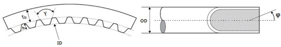 The test section can be described as a simple tube in a tube heat exchanger. It consists of an inner grooved tube mounted inside an outer shell tube with a diameter of 16 mm, so that the refrigerant flows counter-current through the inner tube with the cooling water around it. Figure 3 shows the tested microfin tube, and it has 60 fins with a fin height (h) of 0.25 mm, an apex angle (Υ) of 30°, helix angle (φ) of 15~30°, ID and OD of 8.92 mm and 9.52 mm, respectively, and bottom wall thickness (tb) of 0.35 mm. The refrigerant condenses in the test section under fully controlled conditions. The pressure and temperature are measured at the inlet and outlet of the test section using temperature sensors (PT100, RTD sensors) and pressure transducers.