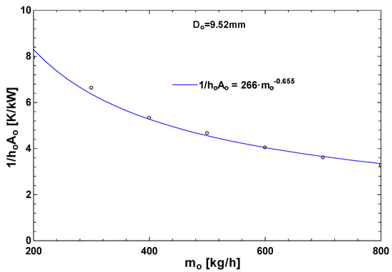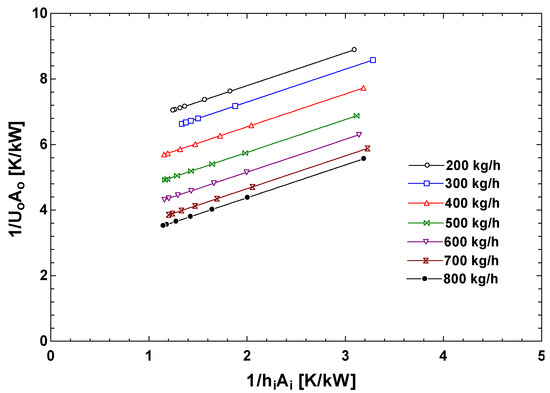 Figure 4 and Figure 5 show, respectively, the Wilson plot and the correlation equation for obtaining the heat transfer coefficient of the annular space with variation of the water flow rate of 200~800 kg/h. As shown in Figure 4, the total thermal resistance value (1/UoAo) of the test section was well expressed as a function of the tube-side thermal resistance (1/hiAi). The total thermal resistance value decreased with the increase of the flow rate of the annular space at the same flow rate in the tube-side because the heat transfer coefficient of the annular flow path increased with the increase of the flow rate. The refrigerant-side heat transfer coefficients were calculated from Equation (1) using the correlation of 1/hoAo from Figure 5.