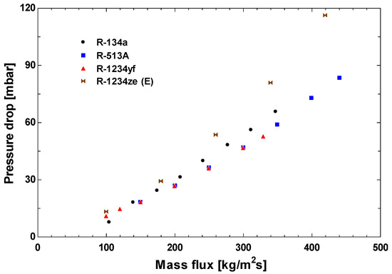 The pressure drops of R-513A and R-1234yf were smaller than that of R-134a when the mass fluxes were larger than 150 kg·m−2·s−1, while the pressure drops of R-1234ze(E) were relatively higher compared with that of R-134a. The pressure drops of R-513A and R-1234ze(E) were 10% lower and 20% higher than R-134a at the higher mass flux in this study. This is partly due to the higher vapor viscosity of R-1234ze(E) compared to R-134a as shown in Table 4. Overall, R-513A can be used as a short- and mid-term retrofit alternative refrigerant for R-134a due to its relatively good thermo-hydraulic performance and small GWP compared to R-134a.