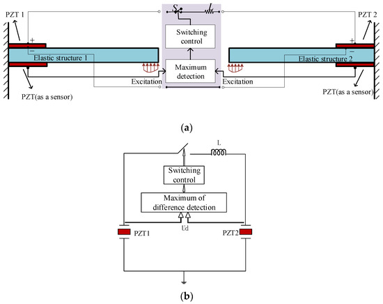 In order to simulate the vibrations between the blades of the aero-engine bladed disk, two cantilevered beams with exactly the same geometric parameters are studied, as shown in Figure 3a. Piezo-patch 1 and piezo-patch 2 on the top surface of the two beams are connected with the SSDI circuit, while the two piezo-patches on the bottom surface of the two beams are used as sensors to generate displacement signals, to drive the switch in a “closed” or “open” state. The two beams are subjected to periodic exciting forces with the same amplitudes at the free end of the two beams, while the phase difference between the two excitations can be adjusted. The piezo-patches on the top surface of the two beams and the SSDI circuit form an SSDI circuit network, but the control rules of the switching circuit are different from the SSDI in Section 2. The extremum detection circuit senses the displacement difference signals of the two piezo-patches on the bottom surface of the two beams. When the difference reaches the maximum or the minimum, the switch is closed and then it is opened instantaneously. The equivalent circuit is shown in Figure 3b.