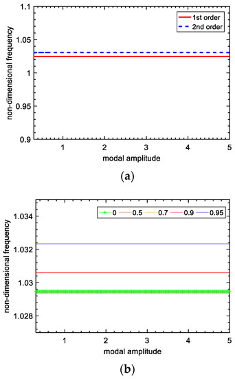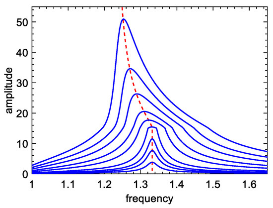 The curves of the two-order natural frequencies changing with the modal amplitude are plotted in Figure 5a, when is equal to 0.9, and the second-order frequency-changing curves (corresponding to the blue line in Figure 5a) in different voltage inversion factors are plotted in Figure 5b. As we can see from Figure 5, the natural frequencies of the two-DOF system with the SSDI network are almost the same, and invariable with the increase in modal amplitude (that is, the amplitude of excitation), which is different from other kinds of nonlinear systems [24]. For a typical nonlinear system, such as a dry-friction system, its frequency changes with the modal amplitude as shown in Figure 6. Usually, there is a typical “skew” phenomenon in the dry-friction system, as shown in Figure 7. However, the piezoelectric system we constructed does not have this phenomenon. It is shown as a straight line; that is to say, the magnitude of external excitation will not affect the frequency of the system, which shows that our piezoelectric system will not bring serious nonlinear characteristics to the system. The straight line represents the connection to the top of the frequency response curve. The variation of each order of frequency of the lumped model when connecting the SSDI network is tiny, compared with the open-circuit case. In addition, the influence of the voltage inversion factor on structure frequencies is minimal. Therefore, the variations of the natural frequencies of the mechanical system are insignificant when an SSDI network is utilized to reduce the vibration.