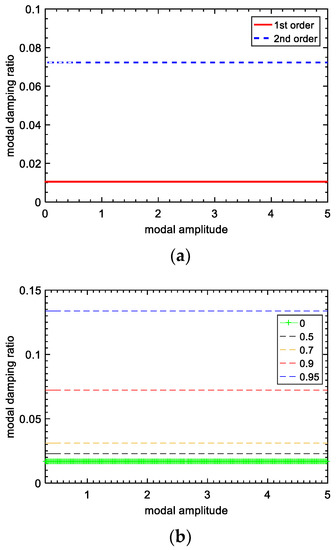 Modal damping ratio vs. modal amplitude: (a) modal damping ratios of the lumped model; (b) modal damping ratio changing curves in different s.