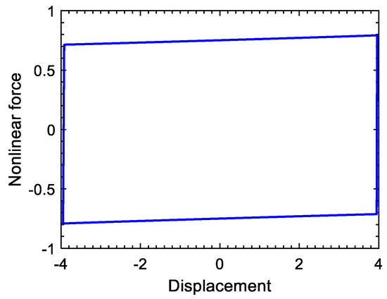 For the lumped model in Figure 4, the displacement difference curve of and , and the nonlinear force curve in the time domain when the exciting frequency is set to 1 and is 0.9, are plotted in Figure 9. The loop of nonlinear force vs. displacement difference is described in Figure 10. When the voltage inversion factor varies, the nonlinear force generated by the piezo-patch voltage will vary accordingly, as is illustrated in Figure 11. In these figures, the units of displacement and nonlinear force are dimensionless. The higher the voltage inversion factor, the closer the waveform of the nonlinear force is to the rectangle, and the larger the damping effect.