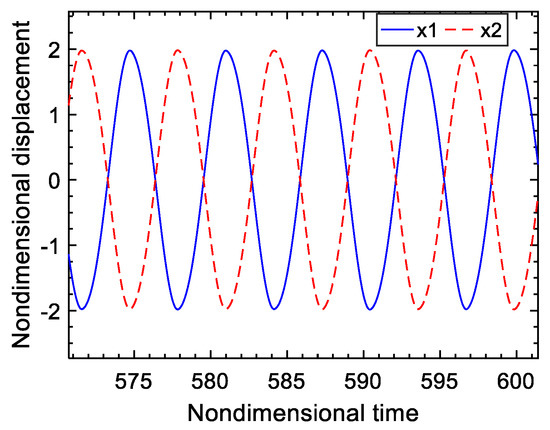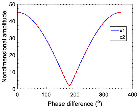 When the exciting forces acting on the two masses have the same amplitudes, but a different phase if , the changing curves of the steady-state maximum displacement amplitude of the two masses with the phase difference of the two exciting forces are plotted in Figure 12. It can be seen that the phase difference plays a dominant role when the amplitudes of the exciting forces acting on the two masses are the same. Changing the phase difference of two exciting forces can improve the damping performance of the electromechanical system. When the phase difference of two exciting forces is set to 0°, the amplitudes and the phases of the two masses are identical, with the result that the voltage difference across the switch is zero. The switch is out of action at that moment, and the vibration is not reduced at all. When the phase difference of two exciting forces is set to 180°, the two masses have the same amplitudes but the opposite phase, with the result that the voltage difference across the switch reaches the maximum. This time, the vibration amplitudes of the two masses achieve the same value and the amplitudes approach the minimum, that is, the optimum vibration damping effect can be obtained. The displacement response curves of the two masses, in a time domain when the phase difference of two exciting forces is 180°, are described in Figure 13. Figure 14 is the sweeping frequency comparison curves of the lumped model with and without an SSDI network, when the phase difference of two exciting forces is 180°. It can also be seen that the electromechanical system with an SSDI network has the perfect damping effect when the two exciting forces are antiphase. It is worth noting that the larger the voltage inversion factor, the better the damping effect. When , the vibration reduction can be above 90%.