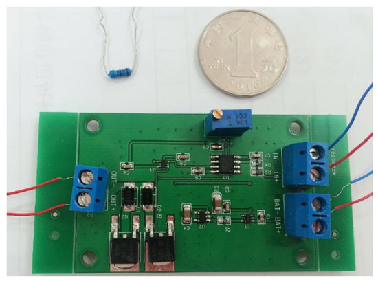 A low-power integrated switching circuit is designed and implemented to fulfill the switch control, and the size of the integrated circuit board is only 60 mm × 40 mm, as shown in Figure 15. Three modules are included in the switching circuit: the battery module, detection module of the displacement extremum and switching control module. A low-pass filter is used to filter the displacement signal and provide a proper phase delay. A comparator is implemented to finish the detection of extremums, by the use of an ultra-low power operational amplifier set in the circuit, and change the displacement signal into a square signal for controlling the switch. The switch function is realized by an NMOS field-effect transistor and a PMOS field-effect transistor (MOSFET) together with two diodes. The types of NMOS and PMOS in the switching control block are NTD20N06 and NTD20P06, respectively. The high-performance ultra-low-power comparator plays an important role in the switching circuit together with the MOSFETs, and it requires just a few for switching operation. This low-power analog circuit can be powered by a 3V button battery (CR2032), and its battery capacity is 3 V ∗ 210 mAh = 630 mWh. The switching circuit board needs about 0.5mW power in total, which means that with a 3V button battery the whole system can work for 630/0.5 = 1200 h.