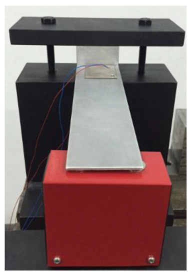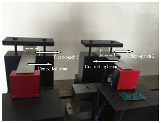 The configuration of the beam used in the experiment is shown in Figure 16, and the parameters of the beam are shown in Table 2. PZT 1 was set near the clamped end to connect the SSDI shunt circuit, and PZT 2 was set at the same position on the other surface of the beam to produce displacement signals (expressed by the voltage unit in this experiment) to control the switch. An electromagnetic vibrator was set at the free end of the beam to excite the beam vibration. When a displacement extremum was detected in the voltage signal of PZT2, a trigger signal was generated to turn on the electronic switch, so that the voltage on the PZT1 was inverted. Vibration experiments of the open circuit system were also carried out under the same exciting force to compare the dynamical characteristics of the nonlinear system with an SSDI shunt. The parameters of piezo-patches in this work are demonstrated in Table 3.