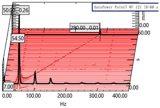 Because the vibration signal is affected by an external signal, such as a noise signal and circuit interference frequency, there will be some interference frequency in the collected signal. After carrying out an FFT transform on the time domain signal (Figure 24), the vibration amplitude corresponding to the excitation frequency can be observed in the spectrum (Figure 25). The purpose is to remove the influence of interference noise.