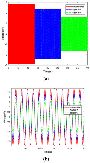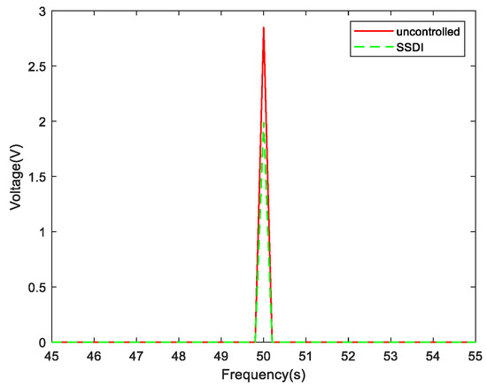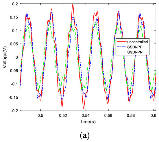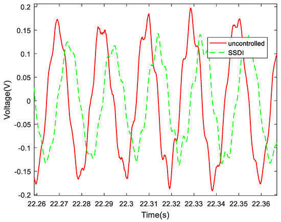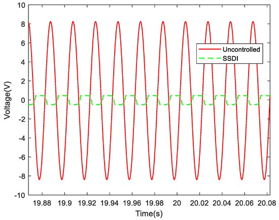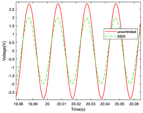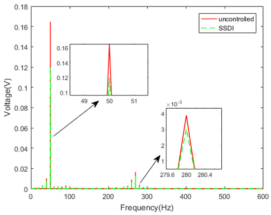 The displacement responses (voltage unit) with and without an SSDI circuit, when the excitation frequency is set to the first-order resonance frequency (50 Hz), are illustrated in Figure 22. It shows that the waveforms in the time domain are very clean when the periodic excitation is sinusoidal and single-frequency. The frequency response curves, with and without an SSDI shunt when the exciting frequency is set to 50 Hz, are plotted in Figure 23. As we can see, the displacement amplitude of the system with SSDI shunt is reduced significantly (about 30%) compared with the uncontrolled scenario.