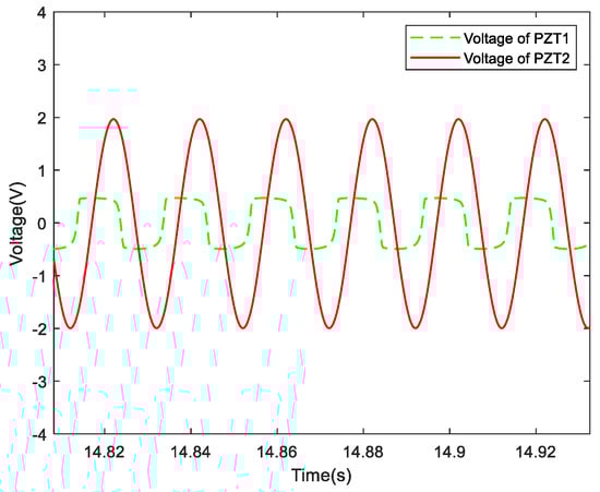 When the excitation frequency is fixed, the steady-state response of the system in the time domain can be obtained if the number of the vibration cycle is enough. Figure 20 illustrates the evolution of the voltage on piezo-patch 1 with and without an SSDI circuit when the excitation frequency is set to 50 Hz (near the first-order resonance frequency): the solid line corresponds to the open circuit, and the dotted line to the SSDI shunt. The measured steady-state displacement (piezo-patch 2) and voltage response (piezo-patch 1) of the system in the time domain when the excitation frequency is set to 50 Hz is plotted in Figure 21.