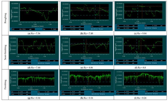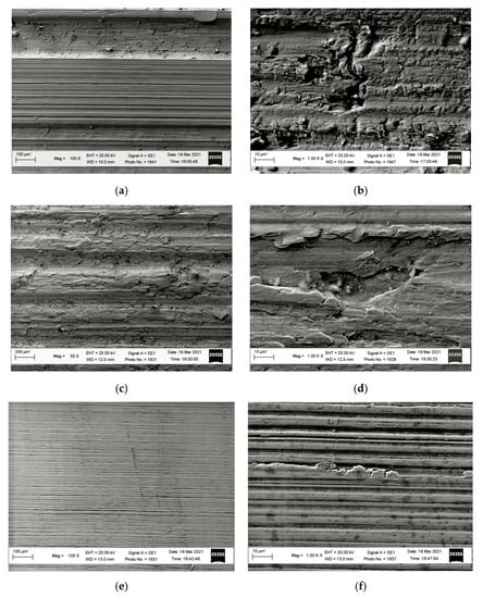 - Rough turning, Figure 4a, caused the formation of deep lines on the surface, which can be considered a consequence of intermittent cutting. The uneven surface relief was a negative factor caused by the vibration of the cutting tool, the workpiece, and machine parts. This reduced the workpiece surface quality.