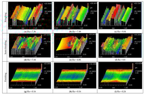 - Semi-finishing resulted in the surface with a pronounced effect of plastic deformation. There were noticeable scaly tears on the surface. Their height indicated a low temperature in the treatment zone. This surface-forming mechanism also evidenced the cyclical interaction between the tool and the workpiece surface. Plastic deformation causes the strengthening of the surface layer and structural and mechanical heterogeneity of surface properties at the micro-level.