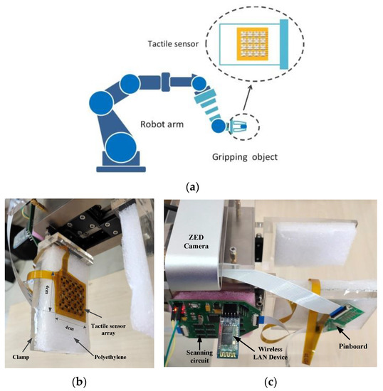 Robot with flexible tactile sensor array. (a) Schematic diagram of grasping operation with tactile sensor. (b) Instalation of tactile sensor array at the clamp of robot. (c) The assembly of tactile data collecting system.