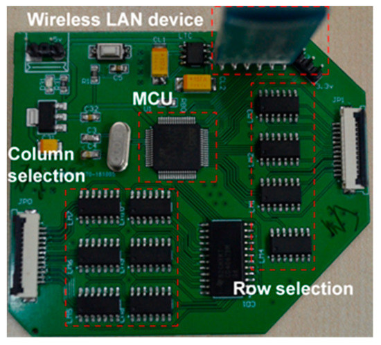 The arrangement of wires in the sensor array is simplified by connecting different cells in corresponding rows and columns. To eliminate the cross-talk between different sensor cells and improve the accuracy of information acquisition, a zero-potential method [36] that can efficiently achieve crosstalk elimination based on the row-column scanning circuit is adopted. The scanning circuit board is shown in Figure 3 and is composed of multiplexers, a microcontroller unit (MCU, STM32F103), an analog-to-digital converter (ADC, 12 bits and 0.806 mV resolution), reference resistances, and operational amplifiers. The measurement principle of the scanning circuit is that the row multiplexer is controlled by MCU to select one of the rows, and then the output of each column of the operational amplifiers is connected to the ADC through the column multiplexer. The output voltage of each cell can be scanned and converted to digital signals. The corresponding resistance value can be calculated by the product of the input voltage and reference resistance of each cell divided by the output voltage of each cell.