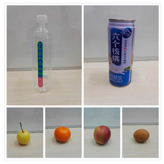 To train the prediction models, a grasping dataset of different objects was collected. Six kinds of objects (plastic bottle, pop-tip can, pear, orange, nectarine, and egg) are selected as test objects, which are shown in Figure 6. The hardness and volume of the test objects are different, which can fully reflect the scenarios encountered by the robot grasping system in grasping objects within the range of tactile sense. A total of five kinds of locations were set for grasping operations, and the grasp operation was carried out 10 times for each object at each location. As a result, 300 groups of grasping data were collected to form a dataset. Half of the data show a stable grasping operation, while the others were unstable. With this dataset, each algorithm of SVC, KNN, LR, and ensemble learning is respectively trained and the corresponding prediction model is obtained.