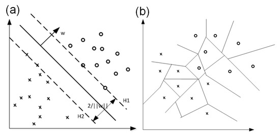 Figure 7a shows the schematic diagram of the SVC algorithm in a two-dimensional feature space. The hyperplane corresponding to boundary H1 is , and the hyperplane corresponding to boundary H2 is , where w is the normal vector. The instance points on H1 and H2 are the support vectors of the training data, and there are no instance points between lines H1 and H2. The width of the interval between two parallel dotted lines is 2/‖w‖, and the model trained by the SVC algorithm aims to maximize the interval.
