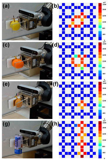 Figure 8 shows the state of different objects being stably grasped by clamps and the corresponding pressure distribution in the sensor array. Each color box represents a tactile sensor cell, and the value of the colors indicates the output voltage of each cell. At the beginning of the grasping operation, the two clamps move to each other, and the sensor array is unloaded. As the tactile sensor starts to contact the object, the output value of the corresponding sensing elementwill increase, and the real-time pressure data transmitted to the processor will be processed by the prediction algorithm to judge the state of grasping. If the model determines that the object is not being grasped, the clamps will continue to tighten up in case the object falls, and the grasping state of the object will continue to be judged circularly. When the grasping state changes from unstable to stable, the clamps of the manipulator driven by the motor will stop moving, and stable grasping operation is achieved. The pressure distribution in the tactile sensor array reflects the contact area and shape between the tactile sensor and the grasped object, which depends to some extent on the shape of the captured object.