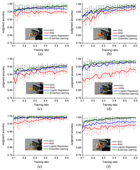 In the actual grasping operation, the prediction models work at each control cycle. When the clamp moves closer to the object, the tactile sensor array measures the pressure distribution, which is then immediately provides feedback to the prediction models to determine if the grasping is stable. If not, the clamp continuously moves closer to the object until the pressure distribution can be classified as stable. By this time, the object is grasped with the robot arm stably. Grasping operations are carried out with different prediction models, the judgment results are recorded in the processes. The judgment results curves at different training ratios when grasping different objects using the four types of prediction models are illustrated in Figure 9.