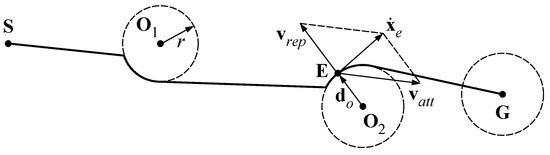 Dealing with motion planning for obstacle avoidance, several methods are available in the literature [6], such as Rapidly-exploring Random Trees (RRT) [7,8], grid-based algorithms [9,10] or Batch Informed Trees (BIT) and Model Predictive Control (MPC) [11]. A very common approach consists in defining artificial potential fields, which drive the robot to the target inside the workspace [12,13,14]. The result of the potential fields is a set of forces, attractive toward the goal and repulsive from the obstacle regions. Typically, such forces are associated with velocities applied to the end-effector of the manipulator; then, the trajectory can be obtained by numerical integration.