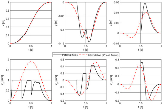where † represents the pseudo-inverse operator according to the Moore-Penrose definition, which intrinsically provides the coefficients of the curve that best fits the original trajectory by minimizing the least squares error. An example is given in Figure 2 in order to show the effect of the smoothing procedure: given the start and goal points and two obstacles preventing from the linear trajectory, the potential fields method described by Equations (1) and (2) gives the path plotted in black, whereas the interpolation procedure described by Equations (3)–(10) returns the Bézier curve plotted in red. A deeper comparison is given by Figure 3, where the Cartesian components of position and velocity of the end-effector are plotted versus time: the path directly obtained by the potential fields algorithm (black plot) presents cusps and discontinuities in the position and velocity profiles, respectively, whereas the trajectory related to the Bézier curve (red plot) is smooth both in position and velocity; thus, it is feasible for it to be assigned to a real manipulator. Bézier curves of higher order have been also tested, but they suffer from too sharp curvatures and high computational times; thus, they are not suitable for the purpose.