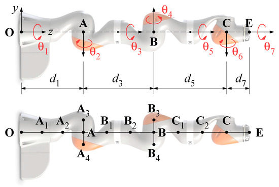 Starting from the results obtained by the authors in [15], the mentioned algorithms are implemented in the present work for a redundant manipulator with full mobility, i.e., the KUKA LBR iiwa 14 R820 robot. The kinematic scheme of the manipulator is shown in Figure 5. The pose of the end-effector in the Cartesian space is defined by the vector , where the last three components are the Euler angles according to the convention. The seven rotations related to the revolute joints of the serial kinematic chain form the joint space position vector, defined as . Thus, the kinematic chain of the manipulator has a redundant degree of freedom with respect to the task. Besides the end-effector , a total of 13 control points () belonging to the kinematic chain characterizes the manipulator, as shown in the bottom picture of Figure 5.