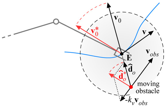 where, as described in Figure 8, is the obstacle velocity, is the repulsive velocity along the direction of , is a gain term and is the modified repulsive velocity applied to the end-effector in combination with the planned velocity . As a consequence, the direction of the repulsive velocity is modified, whereas its magnitude does not change; furthermore, for , the effect vanishes.