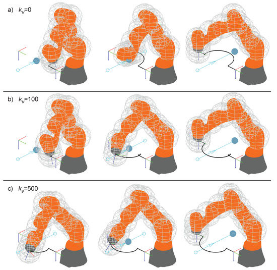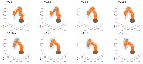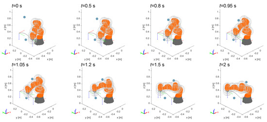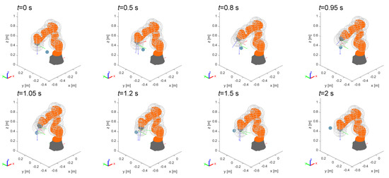 When , the robot tries to avoid the collision by deviating its trajectory in the same direction as the speed of the obstacle; the effect is that the obstacle pushes the end-effector further and further away from its planned path, until the term proportional to the positioning error is able to recover the drift. Furthermore, looking at the second frame of the motion in Figure 19a, the control is not able to avoid the collision, which means that in a real implementation the robot should be stopped at this stage, or more precisely at the first moment when the safety limit is crossed. In the case of the end-effector initially tries to avoid the obstacle by deviating along its speed, but after a while the direction of the end-effector is reversed and the obstacle is successfully avoided on the upstream side. The effect is even more evident with , when the control is able to deviate the end-effector to the upstream side of the obstacle since the first instant of the interaction.