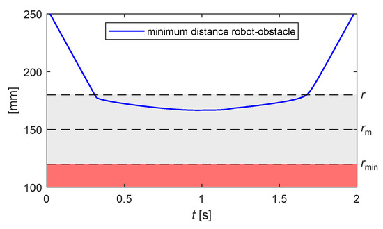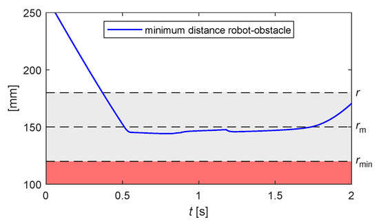 Figure 10 traces the trend over time of the minimum distance between the obstacle and the robot: it is visible how the anti-collision control is activated once the distance becomes lower than the threshold r that delimits the region of influence around the robot control point.