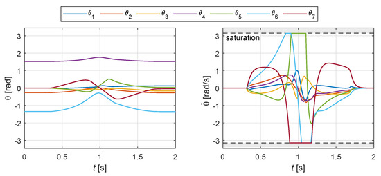 The corresponding profiles of joint rotations and speeds are shown in Figure 11: the effect of the obstacle is visible at , where the joint speed curves suddenly increase their magnitude, reaching in some case the saturation in the middle part of the motion. The effect of the redundancy of the kinematics is clearly visible looking at the final values of joint angles, which are different from the initial ones, despite the Cartesian pose of the manipulator is the same.