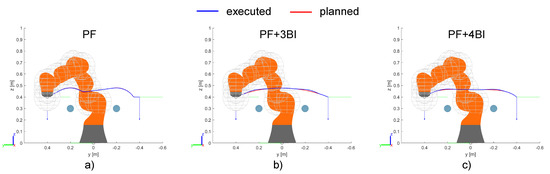 This example presents three simulations showing the differences resulting from different path generation methods. As shown in Figure 18, the robot is asked to move on a linear path, but two fixed obstacles prevent this trajectory by violating the safety distance. Therefore, an alternative path is required. Starting from the standard method of Potential Fields (PF, Figure 18a), two other strategies are adopted, i.e., an interpolation with a third (PF + 3BI, Figure 18b) and fourth (PF + 4BI, Figure 18c) order Bézier curve, respectively, according to the method described in Section 2.