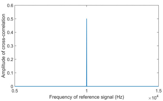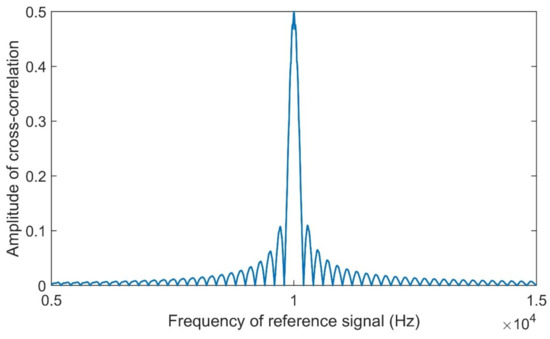 Figure 2 shows an exemplary cross-correlation spectrum. Here, a simple sinusoid function of the frequency 10 kHz is used as the test signal. The result resembles the absolute function of a sine cardinal, which is symmetrical and has its global maximum at the frequency of the test signal. Therefore, the creation of a cross-correlation spectrum is a valid method to generate information about the frequencies of the test signal.
