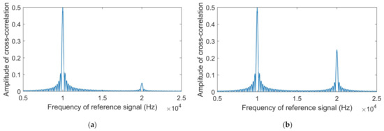 The pace with which the amplitudes decrease depends on different factors. With increasing and a high value of (), the second cosine function converges against zero very quickly. The convergence speed of the first cosine function depends on the frequency difference between the test and reference signal. The smaller the difference is, the lower the convergence speed becomes. This results in two conclusions: Most of the time, the second cosine function will converge faster than the first one. Therefore, the second function can be neglected, and thus the cross-correlation can be simplified to Equation (8):