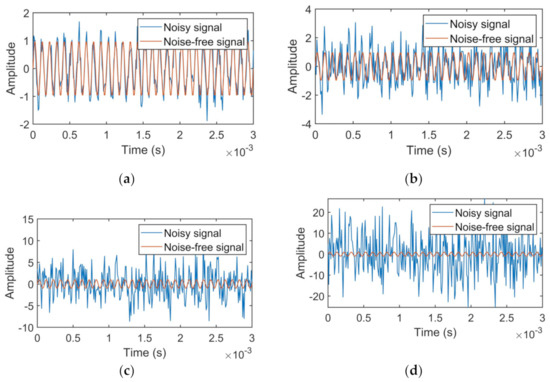 Noisy sinus signals with different SNR; (a) 10 dB; (b) 0 dB; (c) −10 dB; and (d) −20 dB.