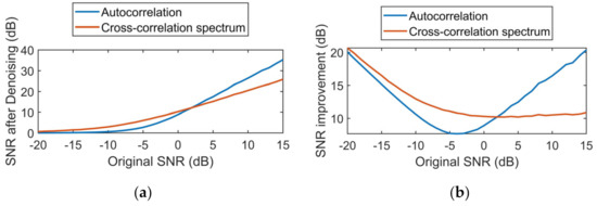 In Figure 8a,b, the denoising of autocorrelation and the cross-correlation spectrum is compared with one another. Figure 8a visualizes the SNRs of noisy signals after processing by autocorrelation and cross-correlation spectrum as a function of their original SNRs, while Figure 8b presents the SNR improvements after processing by both methods as a function of their original SNRs. The figures indicate that whether autocorrelation or the cross-correlation spectrum is superior in terms of denoising depends on the signal’s original SNR. While the SNR improvements of autocorrelation are better in the case of original SNRs which are higher than 2 dB, the cross-correlation spectrum is superior at lower original SNRs. The results imply that the cross-correlation spectrum is more suited to denoise signals of low SNR, while autocorrelation is the better option for signals with relatively high SNR.