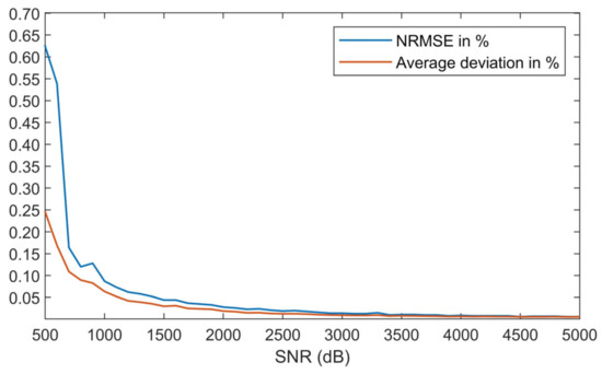 The accuracy can be improved even further by using longer signal parts for the cross-correlation spectrum. This relationship is illustrated in the following simulation. The method has been carried out with different signal lengths on 500 test signals with a SNR of −10 dB. The NRMSE and average deviation of the results were determined for each and visualized in Figure 10. As expected, the results’ accuracy improves with increasing signal length. Beginning from a signal length of 1500 points, the NRMSE and average deviation is below 0.05% even at an SNR of −10 dB.