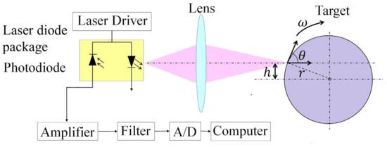 where represents the incident angle between the laser and the target object’s moving direction, while symbolizes the wavelength of the laser diode. The target’s linear speed can be calculated with the target’s radius and the rotational speed , i.e., .