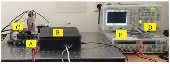 Test system A: Sensor head; B: laser driver + preprocessing circuit; C: Servo motor; D: Oscilloscope; and E: power supply [17] (Reprinted with permission from [18] © The Optical Society).