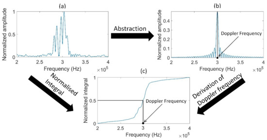 In the first step, the integral of the cross-correlation spectrum is formed. Afterwards, the cross-correlation spectrum is abstracted to the absolute value function of a single sine cardinal with the same maximum integral value as the original cross-correlation spectrum. The frequency, which the abstraction represents, is considered as the SMI signal’s original frequency, and is searched accordingly. As the abstraction is y-symmetrical at the frequency that it represents, the sought frequency would be at the point at which the integral of the cross-correlation spectrum reaches half of its maximum value. Thus, the determination of this point is the aim of the estimation method (see Figure 14).