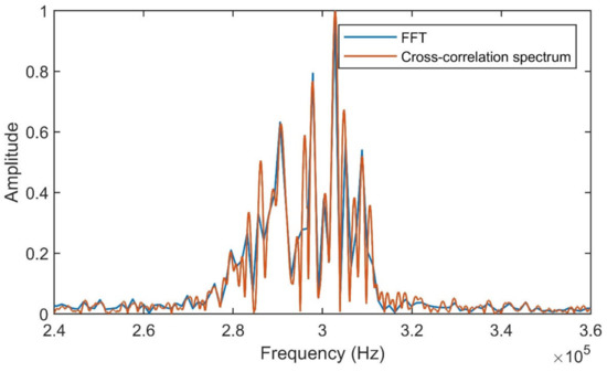 The first experiment aims to validate whether information regarding a signal’s frequencies can be generated with the cross-correlation spectrum. For this purpose, the cross-correlation spectrum and the FFT of an SMI signal were created, normalized, and compared with one another (see Figure 16). A signal of the size of 10,240 data points has been used for this experiment. The sampling frequency has been 12.5 MHz.