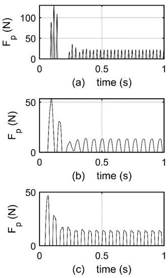 Planing forces in three models being respective to the time responses in Figure 3: (a) delay-free model; (b) delayed model; (c) FOM.