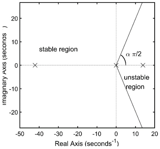 Note that the open-loop system with or without delay is unstable [2]. The free FOM is also unstable, where its unstableness is proven through Matignon’s theorem [25] that the eigenvalues of the FOM do not satisfy the condition represented as in Equation (30) and graphically illustrated in Figure 5: