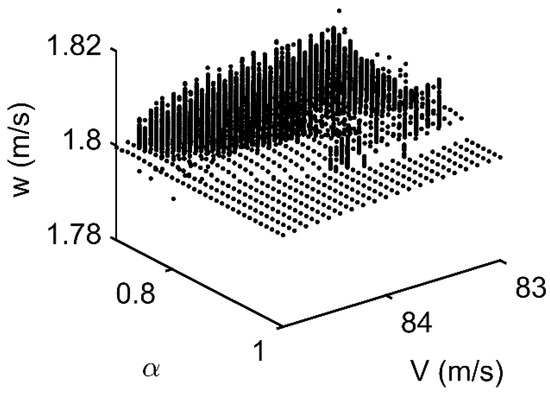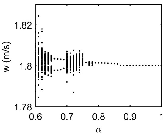 Through the aforementioned analyses, one can realize that both fractional-order α and forward speed V have effects on the FOM stability. Therefore, a bifurcation study has been carried in 3D space, including the forward speed V, fractional-order α, and vertical speed w along the three axes x, y, and z, respectively. Let call α* the minimum fractional-orders before a bifurcation occurs. In Figure 10, it can be observed that with V ≤ 84 (m/s), there is no bifurcation with α > 0.92. It means α* = 0.92. When V = 84.1, α* suddenly jumps down to 0.82. With V > 84 (m/s), α* is almost inversely proportional to V. This analysis shows a general view of the behavior and stability of the FOHSSV. It is worth noting that the delay time is proportional to the length of the HSSV. Vehicles with different lengths have different delay times, corresponding to different fractional orders. Hence based on the study, one can have ideas for better designs of vehicle shapes and robust controllers for real HSSVs by choosing the areas with high stability.