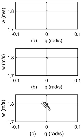 The effect of the fractional-order on the system stability is also illustrated through the phase portrait of two variables w and q around an equilibrium point (z*, w*, θ*, q*) = (0.04, 1.803, 0.02, 0.001). It can be observed from Figure 7a that at α = 0.85, the system is stable at the equilibrium point. When reducing the fractional order, the system remains in its stable state with all α > 0.78. At α = 0.78, a stable limit is born as in Figure 7b and the size of the limit cycle increases at α = 0.74 as in Figure 7c.