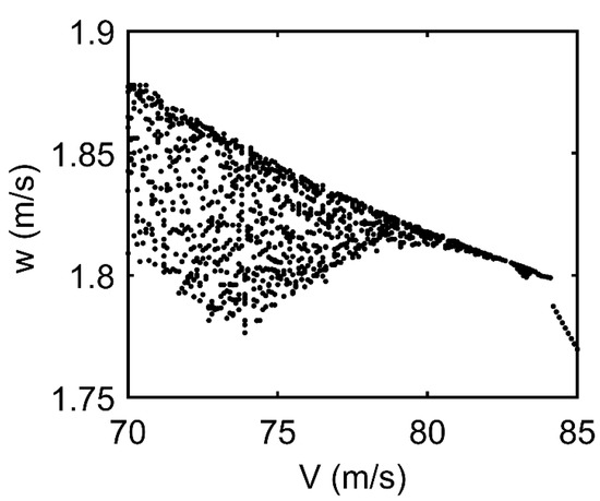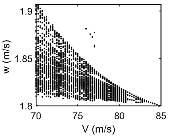 In this section, the bifurcation analysis with respect to the forward speed V of the FOM is also investigated. The simulation result will be compared with that of the delay-free model. The fractional-order of the FOM is selected at α = 0.85. The bifurcation diagram is illustrated in Figure 9. It can be observed from the figure that there is no bifurcation with V > 83.3 m/s. With V in the range [81; 83.3], there are period-doubling bifurcations that merge into a chaotic attractor starting from V < 81 m/s. This analysis suggests the HSSV travel at speeds faster than 83.3 m/s to be more stable.
