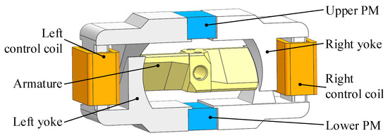 As shown in Figure 1, the structure of TMAAG consists of yokes, an armature, permanent magnets (PMs), and coils. The PMs are installed in upper and lower grooves of the yokes, and the coils are wound on the left and right sides of the yokes. Both the yoke and the armature are made of a soft magnetic material, DT4, the armature is located in the middle of the yokes, its two wings are centered symmetrical, and there is a pitch angle between the wing surface and the axis. The inner annulus surface of the yoke is also designed with a slope groove of the pitch angle.