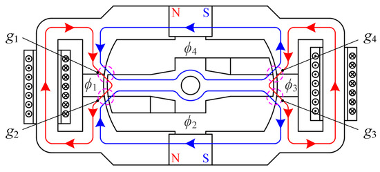 The schematic of the magnetic circuit of TMAAG is shown in Figure 2. When the coils are not electrified, due to the symmetrical structure, the armature is in the neutral position and there is no output torque. When the coils are electrified, the control magnetic flux , generated by the coils and the polarized magnetic flux , generated by the PMs are differentially superimposed at the air gap , , and , thereby generating torque. In addition, since both the armature and the yoke have an annulus structure, there will be no touching in any case. This ensures that the armature can be greatly rotated or moved in the axial direction.