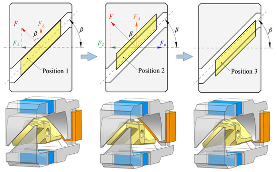 Due to the pitch angle of TMAAG, either the rotation or axial movement of the armature can vary the four air gaps, resulting in corresponding torque variation. When the coils are electrified, a magnetic force is generated. The circumferential component force generates a driving torque to drive the armature to rotate a certain angle . As shown in Figure 3, the armature moves from position 1 to position 2. The upper and lower air gaps vary accordingly, and therefore the magnetic force and its circumferential component force and axial component force further increase. At this time, if an external force pulls the armature to move axially with displacement , the air gaps will vary again. Then, the armature will be acted on by a feedback torque whose value is proportional to the armature displacement . The feedback torque is opposite to the driving torque and counteracts the latter. Therefore, the armature can return to initial position, and the so-called “negative feedback mechanism” can be realized.