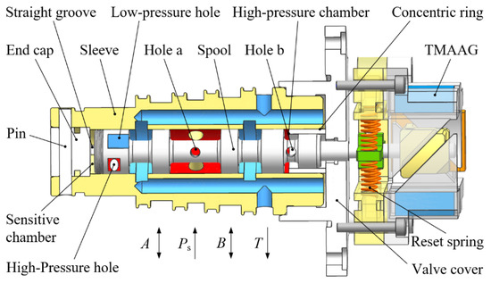 Figure 4 shows the novel 2D valve driven by TMAAG. The armature of TMAAG is fixed on the spool by a pin. In the sleeve, the spool forms a high-pressure chamber and a sensitive chamber with the concentric ring and the end cap, respectively. Two pairs of symmetrical high-pressure and low-pressure grooves are machined on the inner peripheral surface of the spool close to the sensitive chamber. Hole a, hole b, and an internal channel in the spool can pilot the high-pressure oil into the high-pressure groove and high-pressure chamber, and the low-pressure groove is directly connected to the oil return port. The internal surface of the sleeve is also machined with a centrally symmetrical straight groove. One end of the straight groove communicates with the sensitive chamber, and the other end forms a resistance half bridge with the high-pressure and the low-pressure groove to control the pressure in the sensitive chamber. In this way, the pressure difference between the two ends of the spool is controlled to realize the axial movement of the spool.